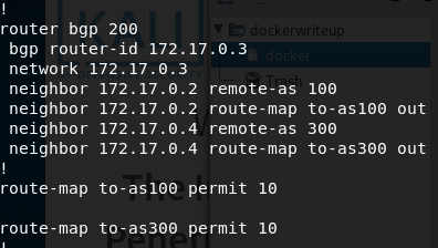 Under router bgp 100, the lines below specify the router ip address, and the network behind the router. Following this are the neighbor statements. The neighbor 172.17.0.3 remote-as 200 specifies that ip as remote autonomous system named by the number specified.