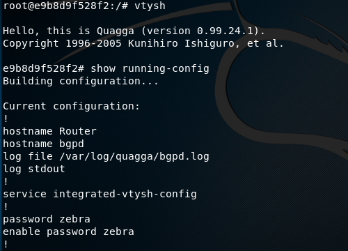 To start this attack using the first router (R1), I entered the router terminal vtysh. Within vtysh, I changed the router configuration.