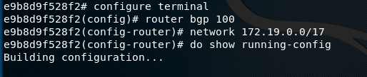 In order to do this, I entered the command configure terminal to edit the configuration. Following this step, I entered the routers configuration by typing the command router bgp 100, and added the network, network 172.19.0.0/17. This allowed me to apply the longest prefix match rule and reroute the traffic to my router.