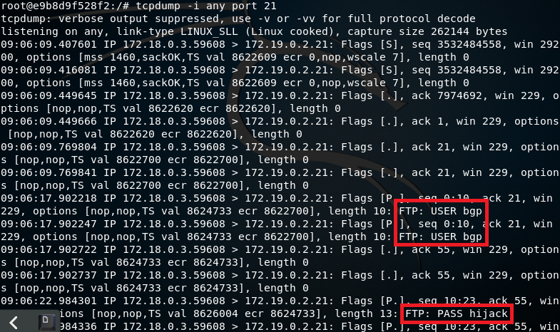 This concludes the setup for the BGP hijack attack. Traffic from R2 is now routed via R1 so that the attacker can listen to traffic exchanged between a user and the ftp server. A popular tool used for listening in on traffic is tcpdump. To listen for data exchanged between the user and the ftp server, I typed in the command tcpdump -i any port 21 into the R1 terminal.